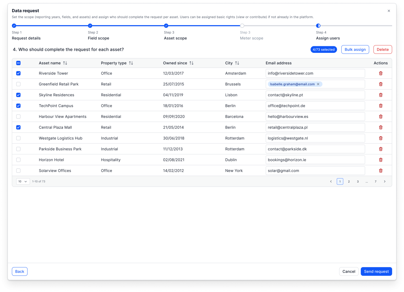 Consultant selects fields/meters directly from asset overview → assigns to external collaborator → request logged in system.